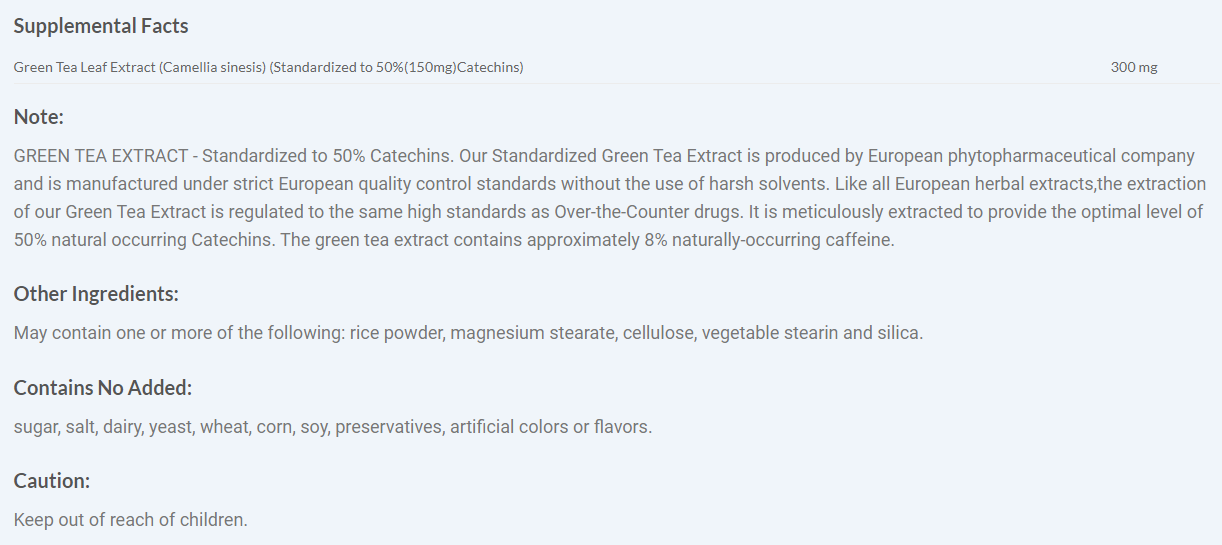 Like all European herbal extracts, the extraction of our green tea extract is regulated to the same high standards as over-the-counter drugs. It is meticulously extracted to provide the optimal level of 50 percent naturally occurring catechins.