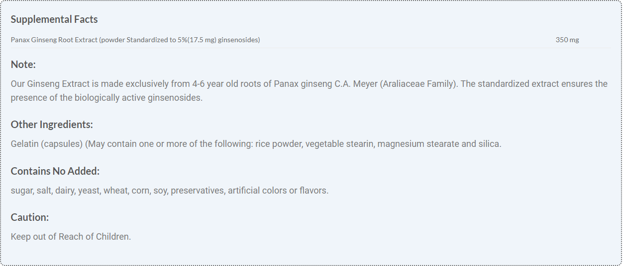 Our Ginseng Extract is made exclusively from four- to six-year-old roots of panax ginseng C.A. Meyer (Araliaceae Family). This standardized extract ensures the presence of biologically active ginsenocides. The whole root powder is included as a source of other compounds that may be active but whose activity is currently unknown.