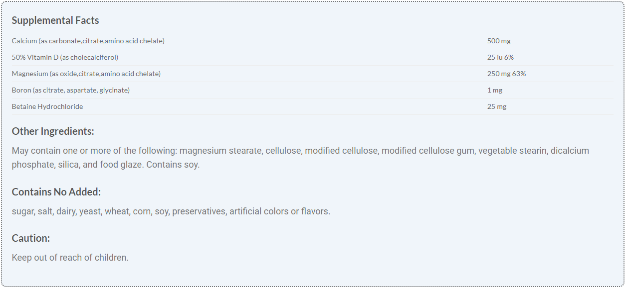 Each tablet delivers 500 mg of very high-quality, easily absorbed calcium. Also included in this formula are vitamin D, magnesium, boron, and betaine hydrochloride.
